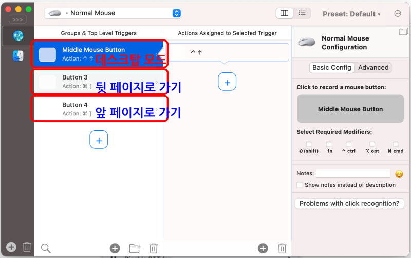 데스크탑모드는 맥이 가지고 있는 강력한 기능 + 어떤식으로든 마우스로 단축키를 만들고 싶은 기능이어서 할당 했습니다.